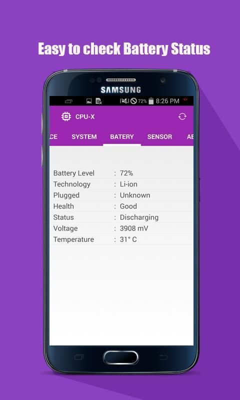 - Check BATERY (level%, technology, health, voltage, temperature, etc. )