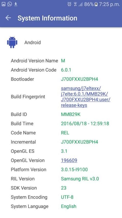 - الأجهزة: اسم الموديل، الهاتف الذكي الشركة المصنعة، وحدة المعالجة المركزية الشرائح، وبناء عدد وإصدار نظام تشغيل الروبوت.