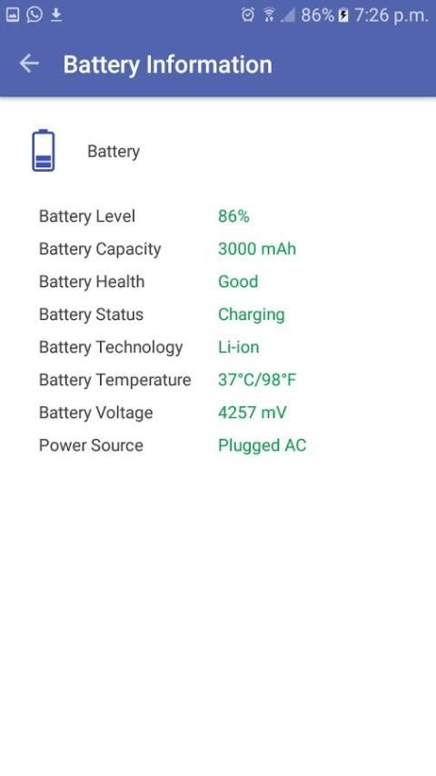 - البطارية: صحة المعلومات، المستوى الحالي، مصدر الطاقة، ودرجة الحرارة، والجهد.