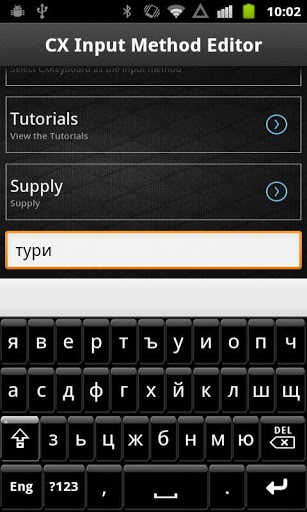 Input Method Editor is a brand new keyboard app for android, which will help you quick switch your inputting method.FAQ:1.What is CX Input Method Editor?It is a smart phone soft keyboard for android. It supports english and russian It allows you to quickly switch input language by pressing a key. It can work well with all android devices.2.What are the characteristics of this app?*It is specially designed for your fast input to save your time.*It supports test editor. You can try it out after selecting this inputting method to familiar with its operation steps.3.How to enable this keyboard?*Open this app, andclick Input method toselect CX Input Method Editor in the popup window;*Then click Text here to try it out;*Go to the Message and try to compose one new message with this inputting method.Conclusion:CX Input Method Editor will suit your personal inputting habit well with its simple operation.Quick download it or share it with your friends.@@@@@@@@@@@@@@@@@@@@@@@@@1. Ignore the warning about the keyboard "collecting your personal data". This is a standard Android message when you activate any third party input method.2. Please read this: This app comes with notifications ads or icon ads.@@@@@@@@@@@@@@@@@@@@@@@@@
