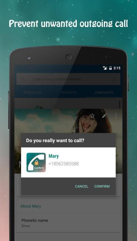 Call Confirm raises up a confirm dialog on any calls include number, photo and contact name to help you decide before outgoing calls.