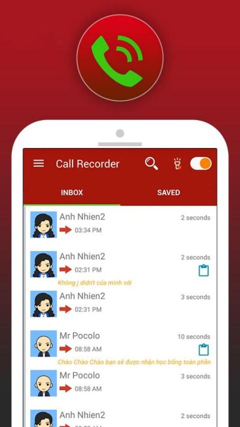 هاتف مسجل التطبيق تمكنك من الجرب تسجيل الملفات بطريقة ذكية. بعد تسجيل المستخدم لديه سجل المكالمات من ملفات تسجيل المكالمات. ثم يمكن للمستخدم الاستماع إلى تسجيل وإضافة ملاحظات وتقاسمها. يمكن للمستخدم تحديد محادثة مهمة، حفظه، وأنه سيتم تخزينها في فئة مهمة. إن لم يكن، سيتم حذف التسجيلات القديمة عندما تملأ دعوات جديدة تصل البريد الوارد.