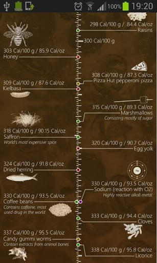 Rich and comprehensive visualization of calorie contents of various foods, beverages and fuels, enabling anyone to explore and compare them in a swift, clean and coherent fashion