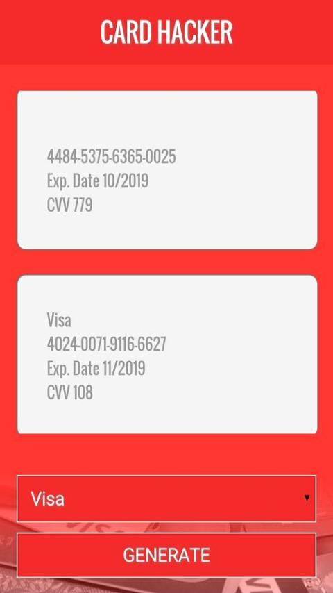 هذا التطبيق يولد أرقام بطاقات الائتمان وهمية، يتم إنشاؤها بشكل عشوائي والتحقق من صحتها مع الخوارزمية Luhn. تم إنشاء هذه الأداة لاختبار أي موقع يسمح transacations بطاقة الائتمان ونرى كيف معالجة المعلومات. العديد من مطوري البرمجيات استخدام هذا النوع من الأدوات لاختبار مشاريعهم قبل أن يتم الإفراج عنهم.