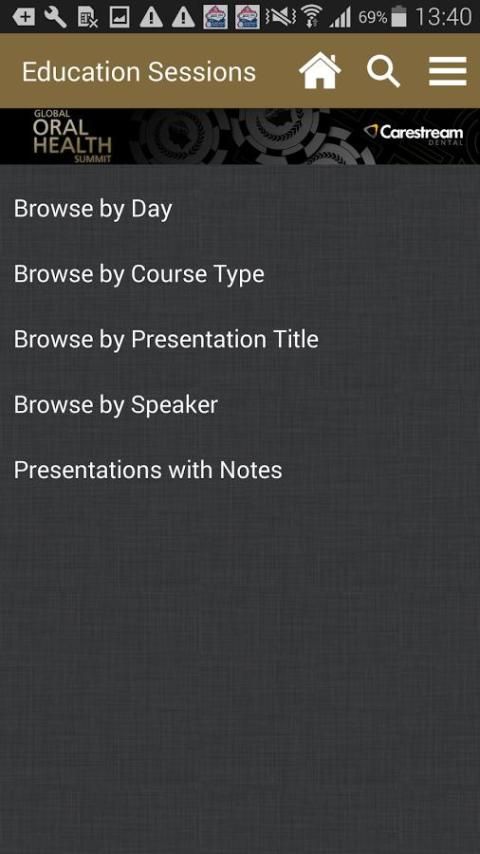 يسمح Carestream الأسنان GOHS 2016 تطبيقات الهاتف المتحرك لك لعرض العروض التقديمية، تفاصيل المتكلم، والعارضين من المؤتمر. يمكن للمستخدمين تدوين الملاحظات المجاورة شرائح العرض التقديمي المتاحة ورسم مباشرة على الشرائح داخل التطبيق. تدوين الملاحظات متاح في وحدة العارضين أيضا.