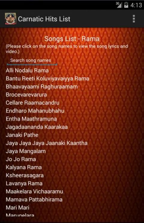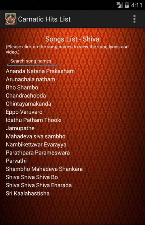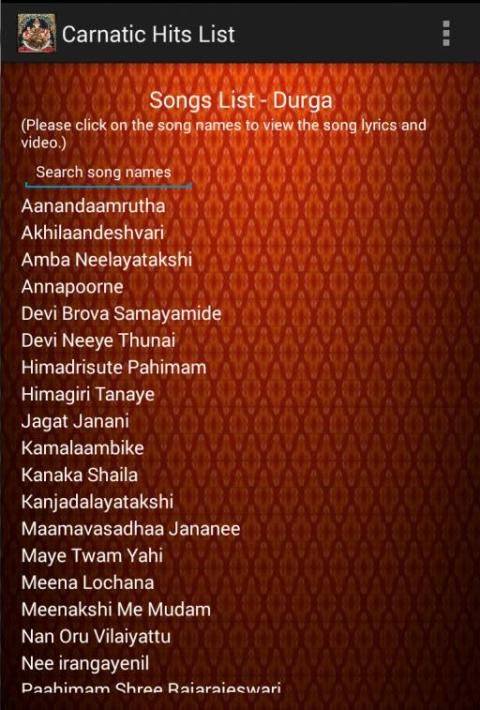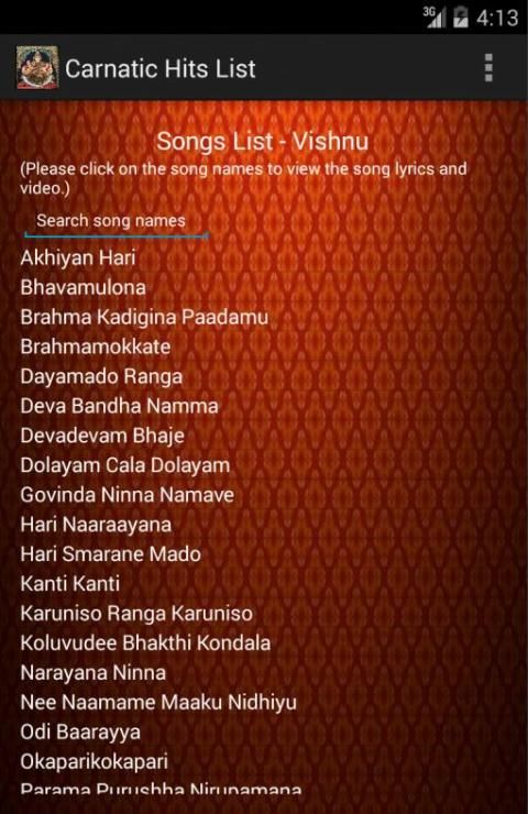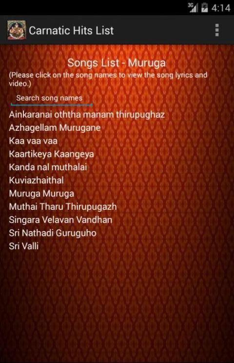 1) The 171 songs are classified for each god. First page will list the images of gods and clicking the image of the god will list the songs of that god. Current available list are - Ganesha, Muruga/Karthick, Shiva, Durga, Rama, Krishna, Vishnu and Lakshmi.