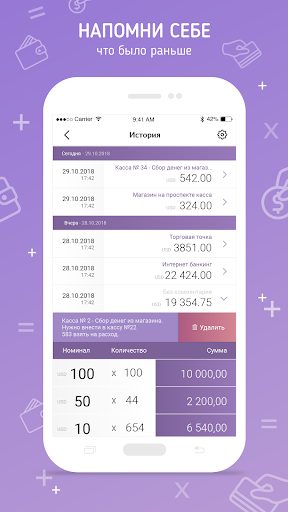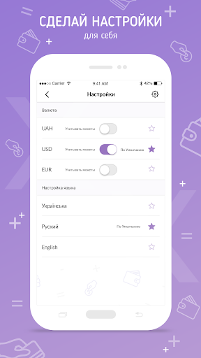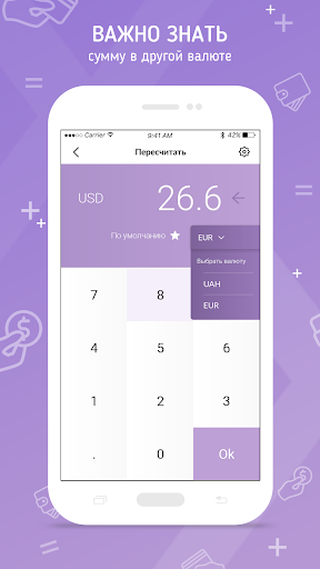 يدعم التطبيق العملات التالية - الدولار الأمريكي، يورو، UAH، فرك، بينما يمكنك العمل بكل عملات في نفس الوقت.استخدم لغة واجهة سهلة الاستخدام - الإنجليزية أو الأوكرانية أو الروسية.سوف تساعد إعدادات التطبيق في إنشاء واجهة مفيدة لاستخدامك.الحفاظ على الملاحظات عند حساب الأموال.