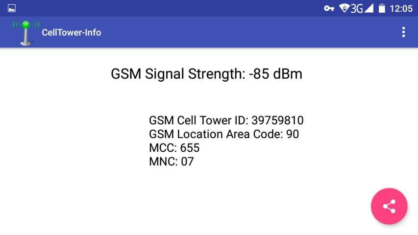 يعرض هذا التطبيق الروبوت الخلية متصل حاليا (المحمول) معلوما برج مثل: GSM قوة الإشارة، GSM معرف الخلية (CID) و GSM رمز المنطقة (أمريكا اللاتينية والكاريبي). أيضا قانون موبايل البلد (MCC) وموبايل رمز الشبكة (MNC). وهي تستخدم أساسا لتصحيح مشاكل الاتصال الخلوية، ولكن استخدامه في أي بالطريقة التي تريدها :).