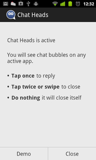 When an incoming chat message arrives, abubble with the picture of the senderappears on the screen — their facebook profile image — and can be tapped to open a message window.Chat Heads let you message within any app. You can view incoming message from friends in any app, and reply with a click. It does no matter what app you're already in. checking email playing games, browsing the web or any other app.Chat Heads provides similar functionality to Facebook's Chat Heads (not the entire Facebook Home product), but runs on every phone model.Current version support Facebook Messenger, upcoming versions will also support SMS, and eventually all chat systems.HOW IT WORKSBy using an Android option called "Accessibility Service", this app captures notifications, and checks if it is a chat message. The app draws chat bubbles on top of any running apps .PERMISSIONSNetwork - Connect to Facebook and download friends images Write external storage - save cache of friends images Draw on other apps - draw the bubble on the running appAccessibility service - Receive incoming notifications