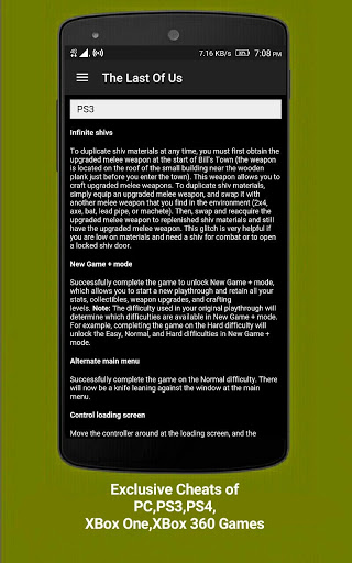 Cheatbook offers you the cheat codes & cheatsheets required to unleash some hidden features of your favourite games and to complete them in an easier way with loads of fun. Its pretty simple to use the app. Pull the drawer from left and select your game from the specified category,scroll down until you find your platform (PC,PS4,PS3,XBox One,XBox 360,Wii).