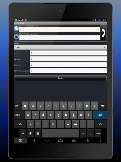 هذا التطبيق يسمح لك تو استخدام جهاز الروبوت الخاص بك وعلى مدار الساعة الشطرنج. مع هذا التطبيق يمكنك أن تلعب ألعاب الموت المفاجئ أو الألعاب مع الوقت زيادة "فيشر". كما أنه يسمح لك لسقسقة على نتيجة المباراة وعدد من التحركات التي، بحيث أصدقائك نعرف جيدا كيف كنت.