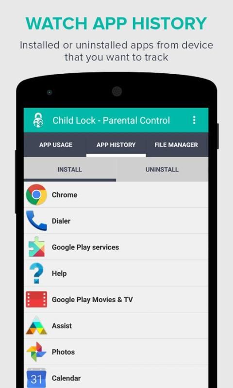 تتكون Lock- الطفل الرقابة الأبوية لقفل تطبيقات تم في يمكنك قفل أي من التطبيقات في الهاتف الخاص بك، وتطبيقات الاستخدام تساعدك على معرفة يومية وأسبوعية وشهرية وسنوية استخدام التطبيق من الهاتف الخاص بك، وتطبيقات التاريخ له تثبيت وإلغاء تثبيت تاريخ التطبيق ، وإدارة الملفات يمكنك قفل الصور الخاصة بك والفيديو التي لا تريد لطفلك لمعرفة وعند نهاية كما أن لديها سجلات المكالمات وظيفيا لحماية سجلات المكالمات الخاصة بك وتتبع على متصفح التاريخ على شبكة الإنترنت من الهاتف طفلك دون إزعاج .
