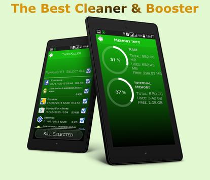 Just one touch, you can boost memory of your android phone, Cool your device by stopping unnecessary apps, clean your cache storage, increase your security (virus)