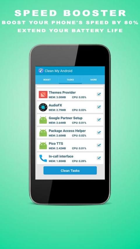 نظيف بلدي الروبوت هو أصغر نظافة الهاتف في السوق. مع تقنية عملية الرصد المتطورة التي يمكن لعمليات الخلفية نظيفة بذكاء، والتوقف عن التطبيقات قيد التشغيل التخفي. فإنه يمكن زيادة سرعة الهاتف الخاص بنسبة تصل إلى 60٪،