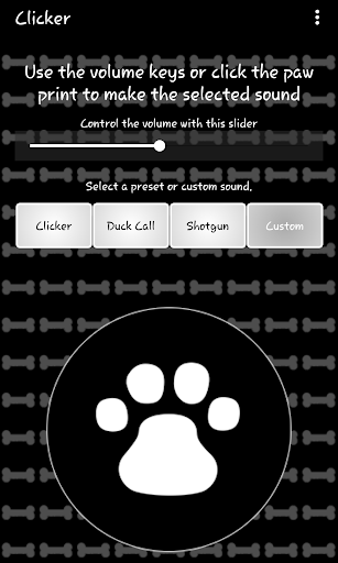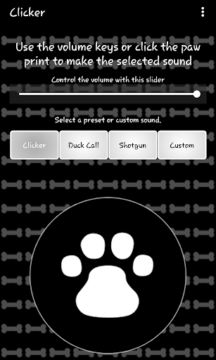 تدريب الكلب الخاص بك للحصول على الطاعة واسترجاع استخدام هذه الأصوات الحقيقية!يمكنك استخدام زر على الشاشة أو أزرار مستوى الصوت لتعطيك شعور الفرس "الحقيقي".يتم التحكم في الحجم على الشاشة حتى يمكن استخدام كلا من أزرار مستوى الصوت كأزرار "Clicker".استمتع بتدريب صديقك الغامض!