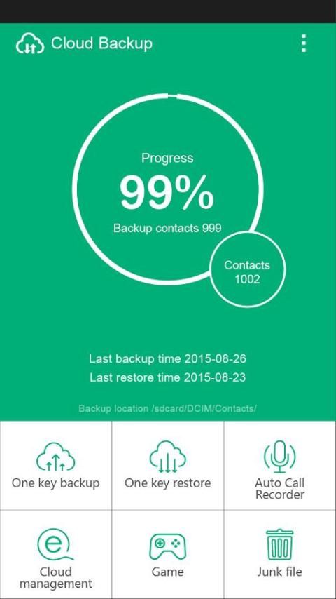 النسخ الاحتياطي الاتصال هو عبر منصة برمجيات الاتصال النسخ الاحتياطي التي تنتجها شنتشن العالم في اليد التكنولوجيا المحدودة لتجنب فقدان جهات الاتصال في الهواتف النقالة، لنقل سريع للاتصالات عند تغيير الهاتف المحمول وبالتالي مساعدتك على تحقيق التغيير في خدمات الهاتف المحمول في دقيقة واحدة، وفريدة من نوعها التلقائي وظيفة تسجيل المكالمات. يمكن للمرء أن احتياطية جهات الاتصال إلى السحابة من خلال النقر على مفتاح واحد بعد الاتصال مع سجل في الحساب عن طريق الانترنت ويمكن للمرء أيضا استخدام نفس الحساب لتسجيل الدخول في صفحة الويب لمعرفة وإدارة جهات الاتصال الموجودة في السحابة.
