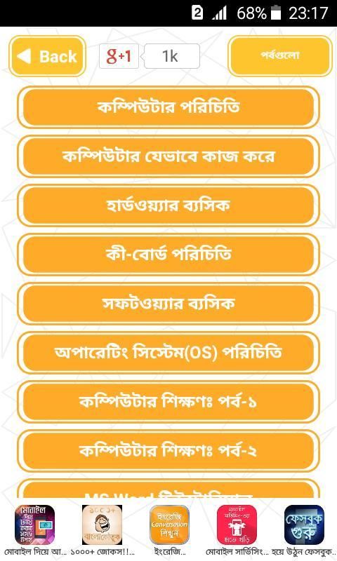 ويضم هذا التطبيق موضوعات مختلفة من دورة الكمبيوتر في البنغالية جنبا إلى جنب مع البرنامج التعليمي باستثناء البنغالية برمجة الكمبيوتر. وتشمل السمات الرئيسية: -