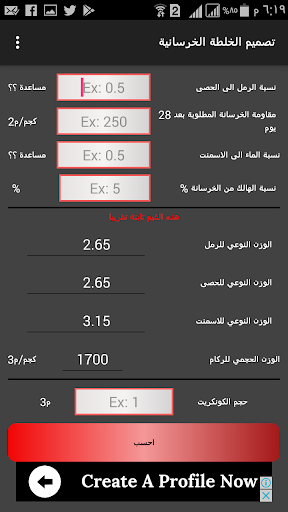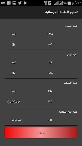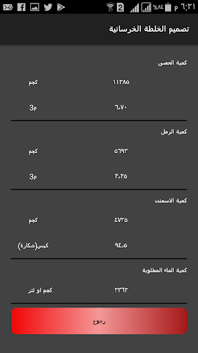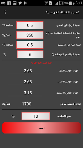هذا التطبيق عبارة عن حساب كميات الخلطة الخرسانية بطريقة الحجم المطلق وتكون النتائج كالاتي: الرمل كغم و م3 الحصى كغم و م3 الاسمنت كغم و كيس/ شكارة الماء باللتر