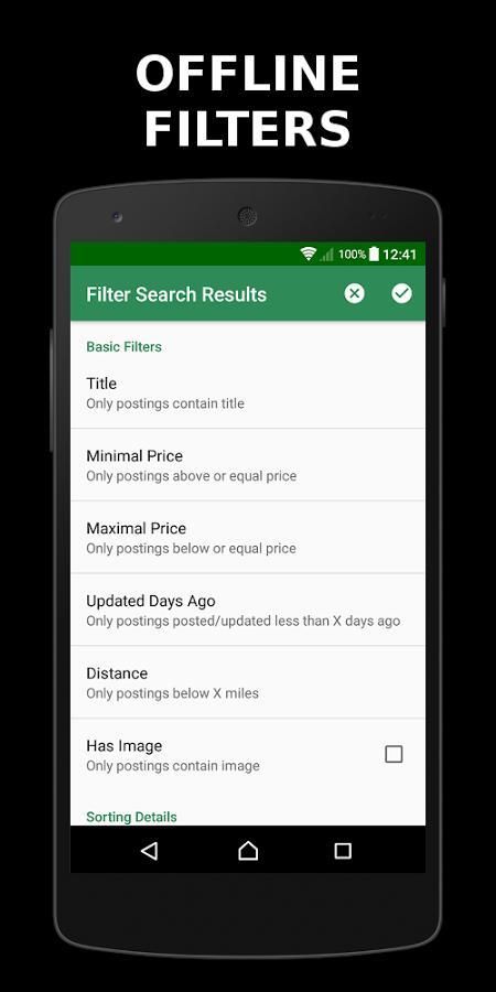 لم تكن قد حصلت مزعج حول كل تحديث للنتائج CL بعد تطبيق مرشحات بسيطة مثل عنوان، النطاق السعري، أو عدد الغرف؟ تطبيقات الروبوت لكريغزلست الموالية في معظمها يحتوي فقط طبقة عرض على شبكة الإنترنت لموقع الويب. وهذا يعني تطبيق أي الحلول الذكية للحصول على نتائج الترشيح يتم استبعاد definetely :( المؤلف يفهم ذلك الوقت هو المال، لذلك قمنا بتحسين آلية CL من خلال تنفيذ المرشحات OFFLINE. الآن أنت لا تحتاج بعد الآن لتوصيل الانترنت للحصول على نتائج البحث التي تمت تصفيتها. سوف Craigsflix تحديث فقط الإعلانات تحميلها! بسيط، أليس كذلك؟ فإنه يوفر وقتك والمال ومزاج جيد ؛-)