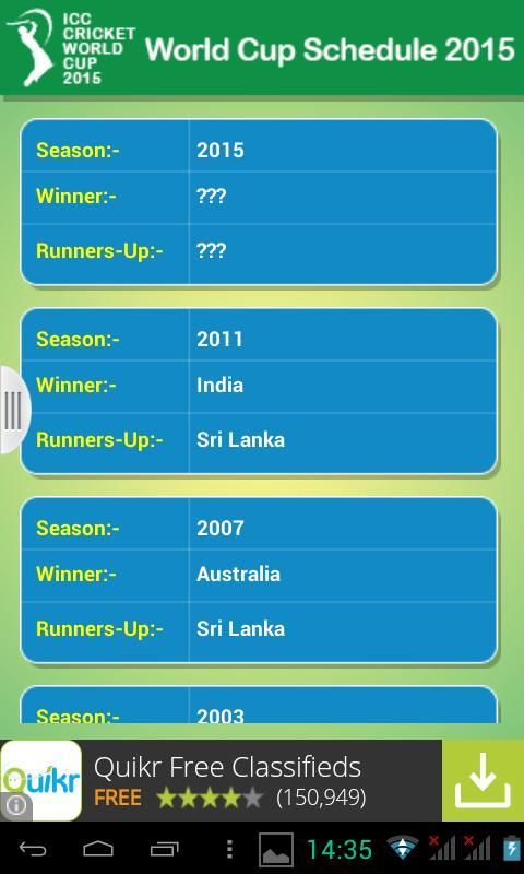 مدهش التطبيق لجدول كأس العالم للكريكيت عام 2015. والتطبيق هو لآخر جدول كأس العالم للكريكيت عام 2015، وأكثر من ذلك بكثير مع ذلك. هناك 2 المجموعات: المجموعة-A والمجموعة-B، كل مجموعة تتكون في 7 فرق وأنها سوف تلعب 6 مباريات قبل ربع النهائي. نيوزيلندا واستراليا استضافة كأس العالم للكريكيت عام 2015. والتطبيق لديه جميلة وجذابة واجهة المستخدم التصميم والرسوم المتحركة، تحميل هذا التطبيق مجانا والتمتع الميزات القادمة هي في طريقها لأن كأس العالم يقترب.