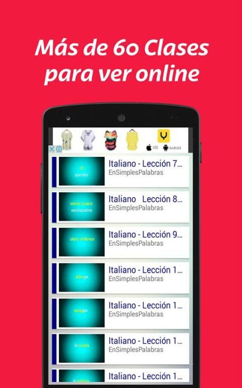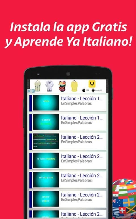 تعلم واحتل الايطالي أبدا سهلة جدا! وهو أن تطبيقنا للهواتف أندرويد يجعل كل شيء أسهل. وهو مصمم لجميع الأعمار، ويحتوي على واجهة ودية من شأنها أن تمنع الصداع أثناء التنقل الدورة باللغة الإيطالية. ليس فقط سوف تتعلم حول النحو وأيضا تتعلم اللغة الايطالية وفهم أولئك الذين يتحدثون بها، بغض النظر عن مدى تعقيد يبدو. وكما قلنا، وهذا هو واحد من أسهل لغات لمعرفة ما إذا كنت أحد المتحدثين الإسباني، كما سماع الصوت هي مشابهة جدا. إذا كنت تدرس بتفان أنك لن تستغرق وقتا طويلا لرؤية ثمار التعلم الخاص بك.