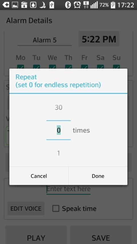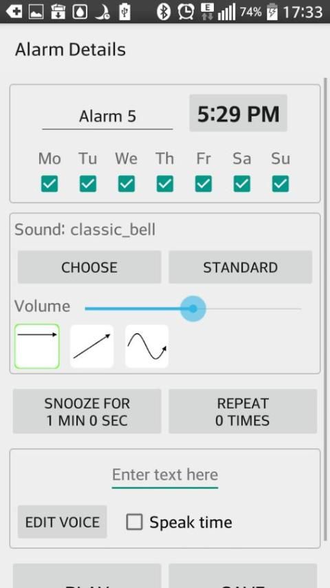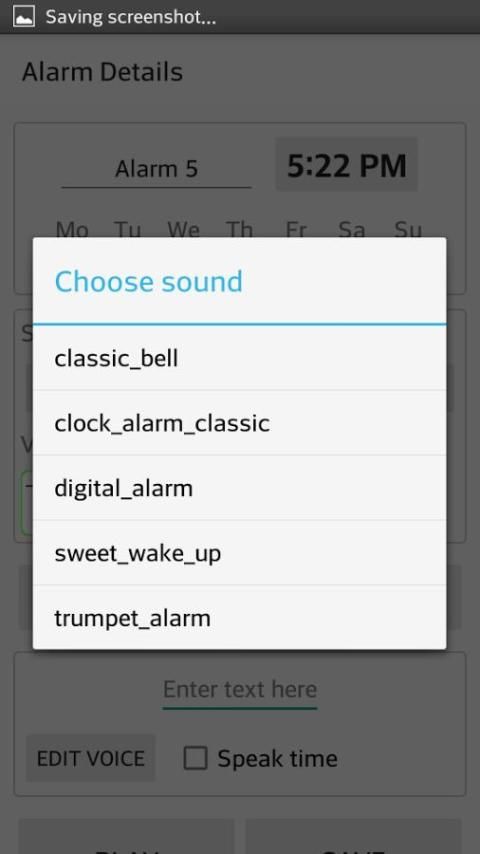 يستخدم إنذار مخصص الساعة إعدادات الروبوت النص إلى كلام (أي محرك، صوت)، ولكن يمكنك ضبط بعض المعلمات صوتا.
