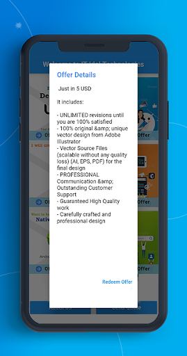 يتضمن هذا التطبيق عروض تطوير الويب وتطوير التطبيقات وتصميمات الشعار وتصميمات الويب وغيرها الكثير.أيضا، يمكنك اختيار خيار تخصيص لإنجاز مشروعك باستثناء هذه العروض.عليك فقط مشاركة ميزانيتك ومتطلبات المشروع.أيضا، سوف تحصل على إشعار عند وصول أي عرض جديد.سوف نؤكد لكم أفضل الخدمات التي ستحصل عليها.