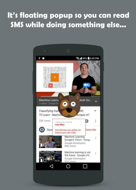 لطيف الإعلام المنبثقة الرسائل القصيرة SMS قارئ مدهشة ومفيدة جدا لهواتف أندرويد. إنها تجربة جديدة والتي يمكنك قراءة جميع الرسائل دون تبديل بين مختلف التطبيقات. نعم فعلا! أنك لن تضطر للتوقف اللعب الخاص بك من فيديو يوتيوب والأفلام أو الألعاب. أكثر من ذلك، فسوف تظهر رسالة عند قفل الشاشة!