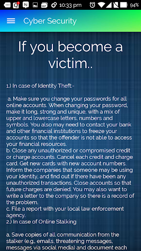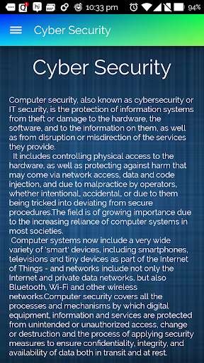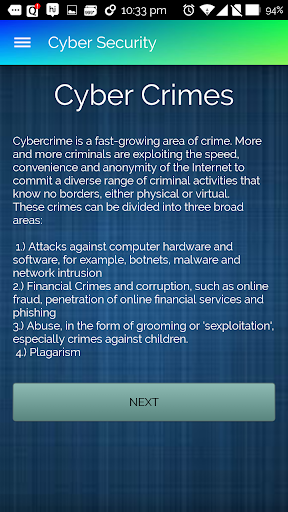 الآن - كل يوم جرائم عبر الإنترنت مثل القرصنة، فإن سرقة الهوية وغيرها أصبحت أكثر وأكثر شيوعا.لتوعية الأشخاص حول هذه الجرائم، نحن نطلق تطبيق الأمن الإلكتروني.Cyber Security App هو تطبيق إعلامي يساعد الناس على فهم سبب أهمية الأمن عبر الإنترنت.