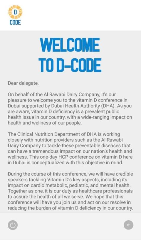 نيابة عن شركة الروابي الألبان، انه لمن دواعي سرورنا أن نرحب بكم في المؤتمر فيتامين D في دبي بدعم من هيئة الصحة في دبي (DHA). وكما تعلمون، ونقص فيتامين D هو مشكلة صحية عامة سائدة في بلادنا، مع تأثير واسع النطاق على الصحة والعافية لشعبنا.