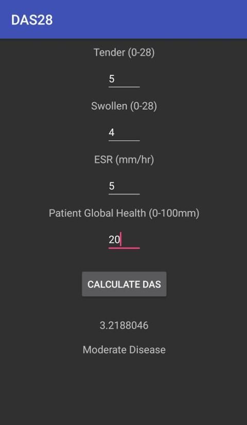 بسيطة ومجانية DAS 28 آلة حاسبة. استخدام المتغيرات من تورم والعطاء العد مشترك، ESR ونتيجة العالمية المريض لحساب DAS 28.