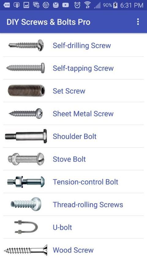 والغرض من هذا التطبيق هو لتعريف المستخدم مع 32 الأنواع الأكثر شيوعا من مسامير أنك من المرجح أن يجد في موقع البناء، على خط الإنتاج، في ورشة عمل أو في متجر لاجهزة الكمبيوتر.