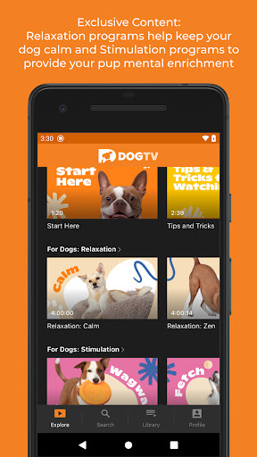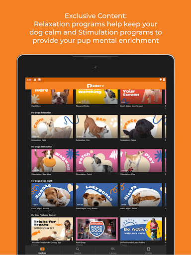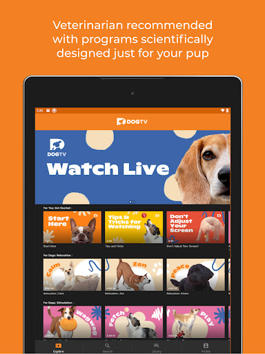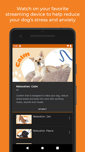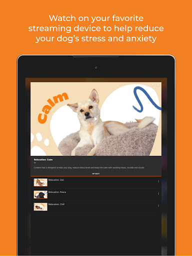 - الاسترخاء: الخيار الأمثل للكلاب مع القلق. يمزج الاسترخاء أصوات الكلاب المهدئة والمشاهد المهدئة للكلاب لإبقاء الكلب استرخاء خلال اليوم.