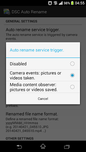 Set the rename service trigger to "Media content observer" to have files automatically renamed if the service is not triggered when the camera events it is selected.