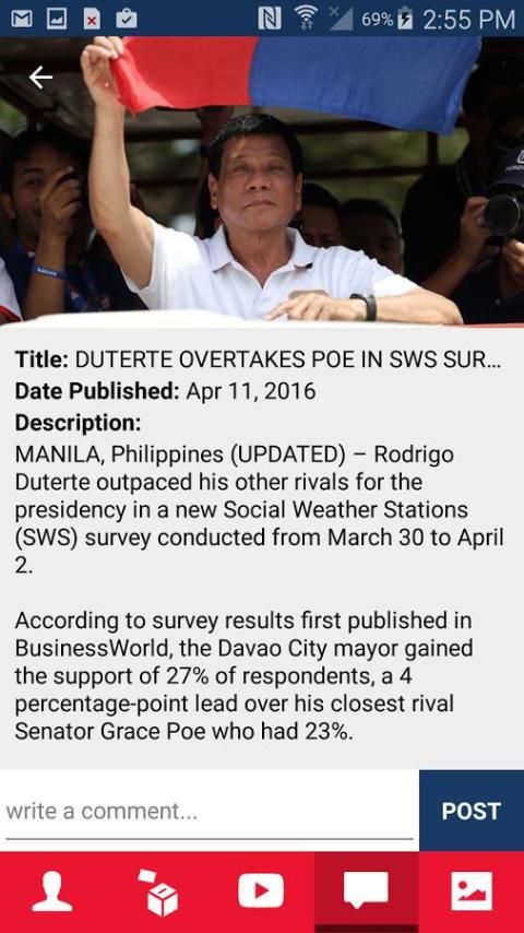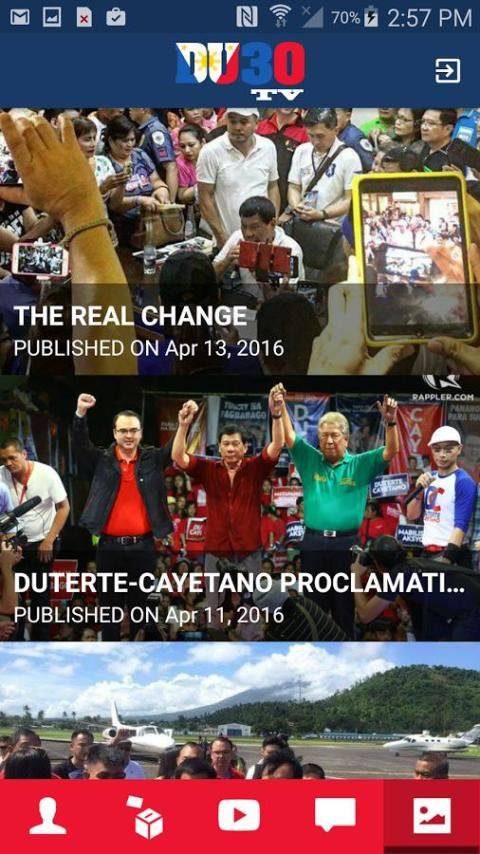 التطبيق Du30 التلفزيون يحتوي على معلومات عن 2016 مرشح الرئاسة الفلبينية عمدة Digong Duterte.