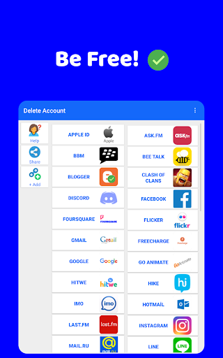 حسابات الوسائط الاجتماعية يمكن أن تستهلك الكثير من وقتك.يحاول هذا التطبيق أن يوفر لك الوقت.لحذف حساب وسائل التواصل الاجتماعي بسهولة، فأنت بحاجة إلى رابط حذف الحساب.لقد أضفنا روابط حذف لأكثر من 50 حسابا اجتماعيا شهيرا.