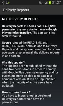 Delivery Reports 2.0.5 has not READ_SMS permission anymore due to the new Google Play permission policy. The app can't list SMS without it.