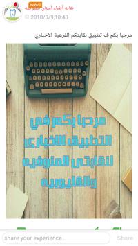 التطبيق الاخبارى النقابي الاول لاطباء الاسنان لعرض جريده الكترونيه لاطباء الاسنان ليكونوا على اتصال مستمر ودائم بنقابتهم الفرعيه مما يسهل على الطبيب التواصل مع انشطه النقابه المختلفه من ايام علميه ومؤتمرات و انشطه اجتماعيه ورحلات كما يساعد على نشر التعاون بين الاطباء لمناقشه مختلف الامور مما يساهم فى زياده الوعى لدى الاطباء