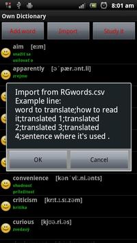 Import your own vocabulary / quiz from csv into your own dictionary ( from SD card or from Dropbox )