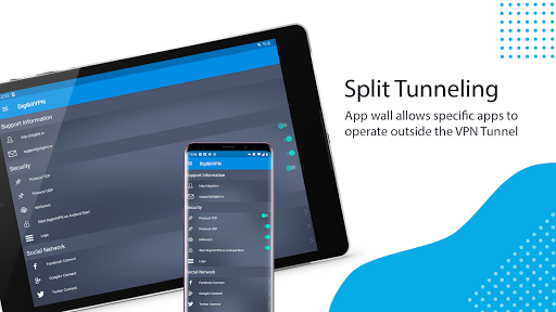 • Split-tunneling, which allows specific apps to operate outside the VPN.