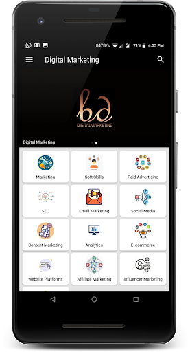 تطبيق تعلم التسويق الرقمي. احصل على عملات مكافأة لكل مرة تقضيها في هذا التطبيق. استبدل العملات المعدنية بالنقود وبطاقات الهدايا. يمكنك كسب المال عن طريق تعلم دورة التسويق الرقمي.