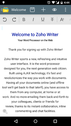 Zoho Docs هو تطبيق إدارة المستندات عبر الإنترنت للأفراد والشركات. يمتد هذا الإصدار المحمول الوصول إلى مستنداتك إلى أجهزة خلوية Android. إذا لم يكن لديك بالفعل حساب Zoho، فيمكنك بسهولة إنشاء واحد داخل التطبيق.
