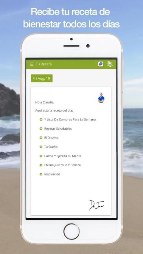 3. وصفة العافية اليومية: سوف تتلقى من الدكتور خوان وصفة اليومية التي تشمل أطباق وصفات صحية، تجريب لمدة 10 دقائق (العشر)، وهي غيض من أجل النوم وممارسة الرياضة والمشورة المتعلقة المضادة للإجهاد مكافحة الشيخوخة. تحتوي هذه الوصفات أيضا العلاجات المنزلية الرعاية أوصت به الدكتور خوان.