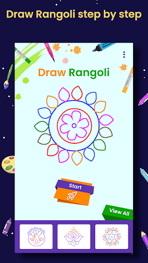Draw Rangoli Painting هو تطبيق رسم الفن سوف يعلمك كيفية رسم رسومات سهلة من رانجولي دون أي خبرة ومهارة. ما عليك سوى اختيار Rangoli المفضل لديك واتبع الخطوات التي تتعلم أنك ترسم تصاميم رانجولي مذهلة.
