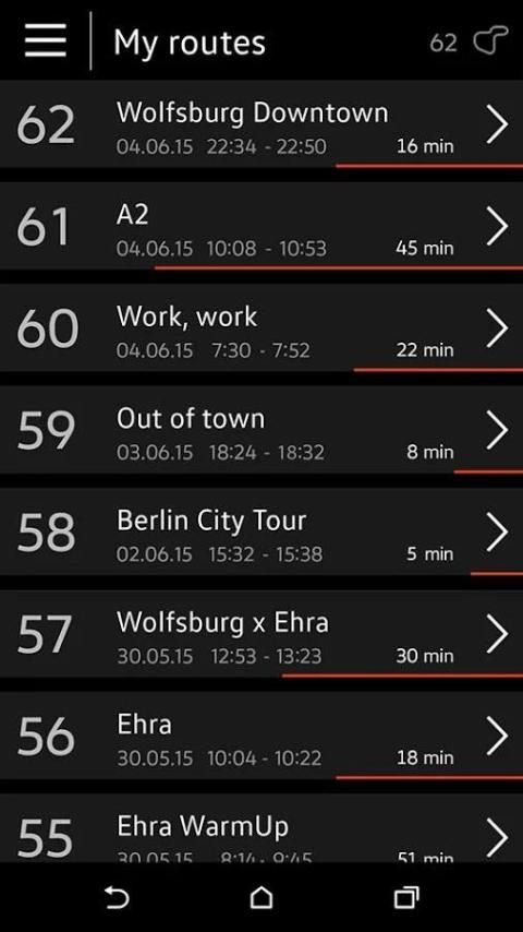 بمجرد الانتهاء من رحلتك، يمكنك عرض مسارك على الخريطة على الهاتف الذكي الخاص بك. تحليل الخاصة بك average- والحد الأقصى لقيم البيانات السيارة جنبا إلى جنب مع الطريق الذي دفعت.
