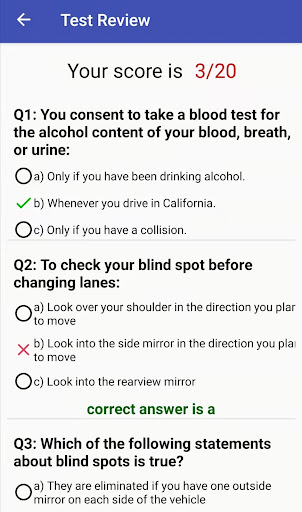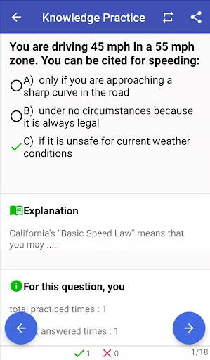 لاجتياز اختبار المعرفة في كاليفورنيا ، يجب عليك الإجابة على 30 من أصل 36 سؤالًا.استخدم وظائف التعلم والممارسة والاختبار المصممة جيدًا في هذا التطبيق للتحقق مما إذا كنت جاهزًا أم لا.