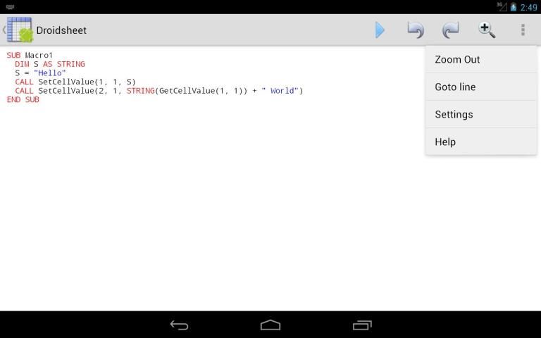 يشمل Droidsheet أيضا قوية لغة البرمجة ماكرو التي يمكن استخدامها لإجراء العمليات الحسابية أكثر تعقيدا. وتستند هذه البيئة برمجة ماكرو حول لهجة منظم الأساسية التي تشمل عشرة أنواع البيانات (منطقية، بايت، قصير، عدد صحيح، طويل، تعويم، مزدوجة، مجمع، STRING وVARIANT) جنبا إلى جنب مع مجموعة متنوعة من المهام بما في ذلك الرياضيات، سلسلة التلاعب، الوقت والتاريخ ونوع الفحص، نوع التحويل، والأهم من ذلك، بعض لمعالجة القيم خلية جدول.