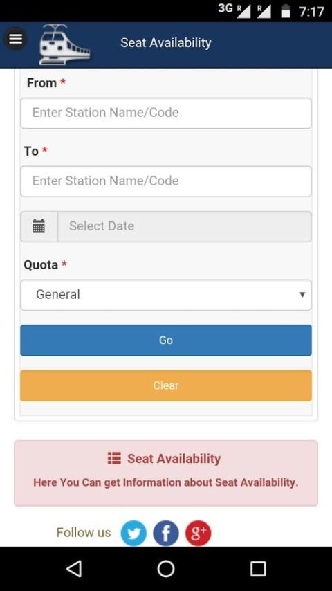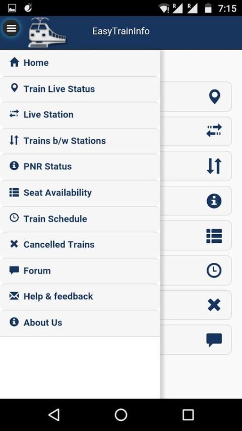 EasyTrainInfo التطبيق هو ودية وفائقة تطبيقات الهاتف المتحرك بسرعة توفير معلومات شاملة عن القطارات الهندية: لايف القطار حالة تشغيل، وصول / مغادرة القطارات في المحطة، ووضع PNR، وتوافر مقعد والتحقيق الأجرة والقطارات بين المحطات، مسار القطار وغيرها الكثير. هنا عبارة عن غرفة المناقشة حيث يمكنك مناقشة على السكك الحديدية الهندية الأحداث، والأخبار، والوضع الخ