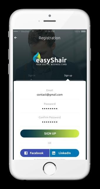 إنشاء ملف تعريف على Easyshair، وتوليد بطاقة الأعمال الإلكترونية الخاص بك أو تحميل ملف بطاقة عملك، بأمان وسهولة تبادل مع جهات الاتصال الخاصة بك (حاليا تبادل البيانات على الانترنت و).