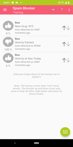 في صفحة المحفوظات، اضغط على الإبهام وأبهام الرموز لأسفل لقرارات مرشح SPAM التلقائي.